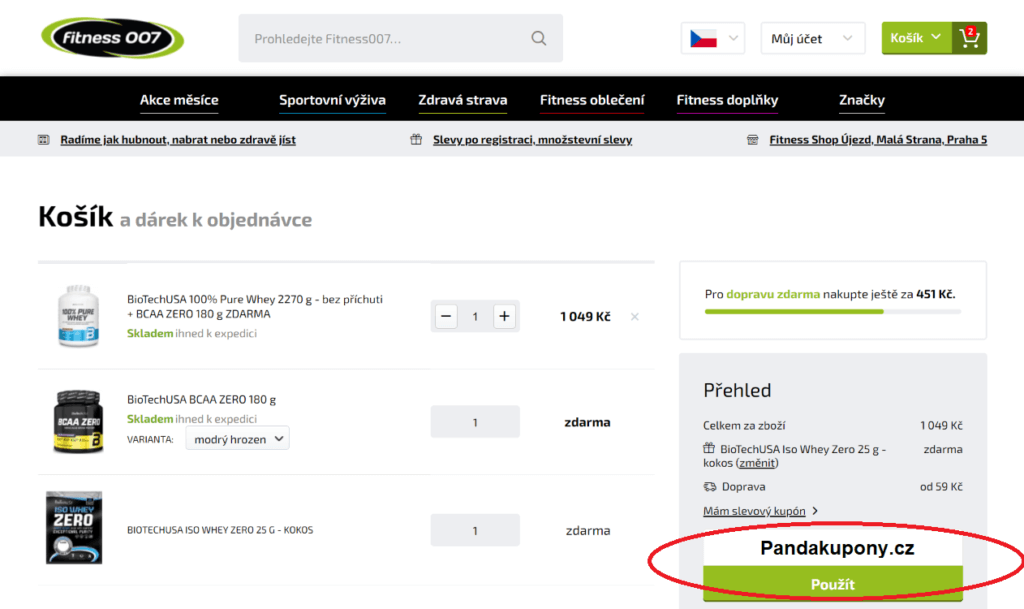 Už jste si vybrali svůj slevový kupón Fitness007 a ptáte se, jak ho uplatnit? Naprosto jednoduše, jakmile si vyberete a vložíte do košíku veškeré zboží, které chcete objednat, tak v prvním kroku, ještě před výběrem platby a dopravy vaší objednávky, stačí zadat slevový kód Fitness007 do kolonky ,,Mám slevový kupón“, kliknete na „Použít“. Pak už jen necháte objednávku přepočítat, vyberete si typ dopravy a platby a dokončíte svůj nákup.